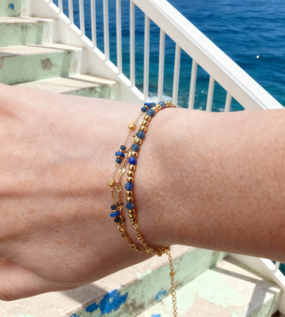Bracelet multi-rangs doré mêlant chaînettes texturées et rangs de perles dorées et en pierres naturelles de lapis lazuli facettées. Ligne fine mais présente, pensée comme un stack prêt-à-porter. Souple et léger, il apporte une touche couleur marine au poignet.
