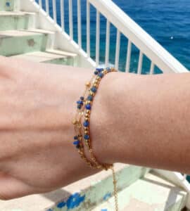 Bracelet multi-rangs à chaines dorées et perles navy, qui habille le poignet d’un esprit bohème.