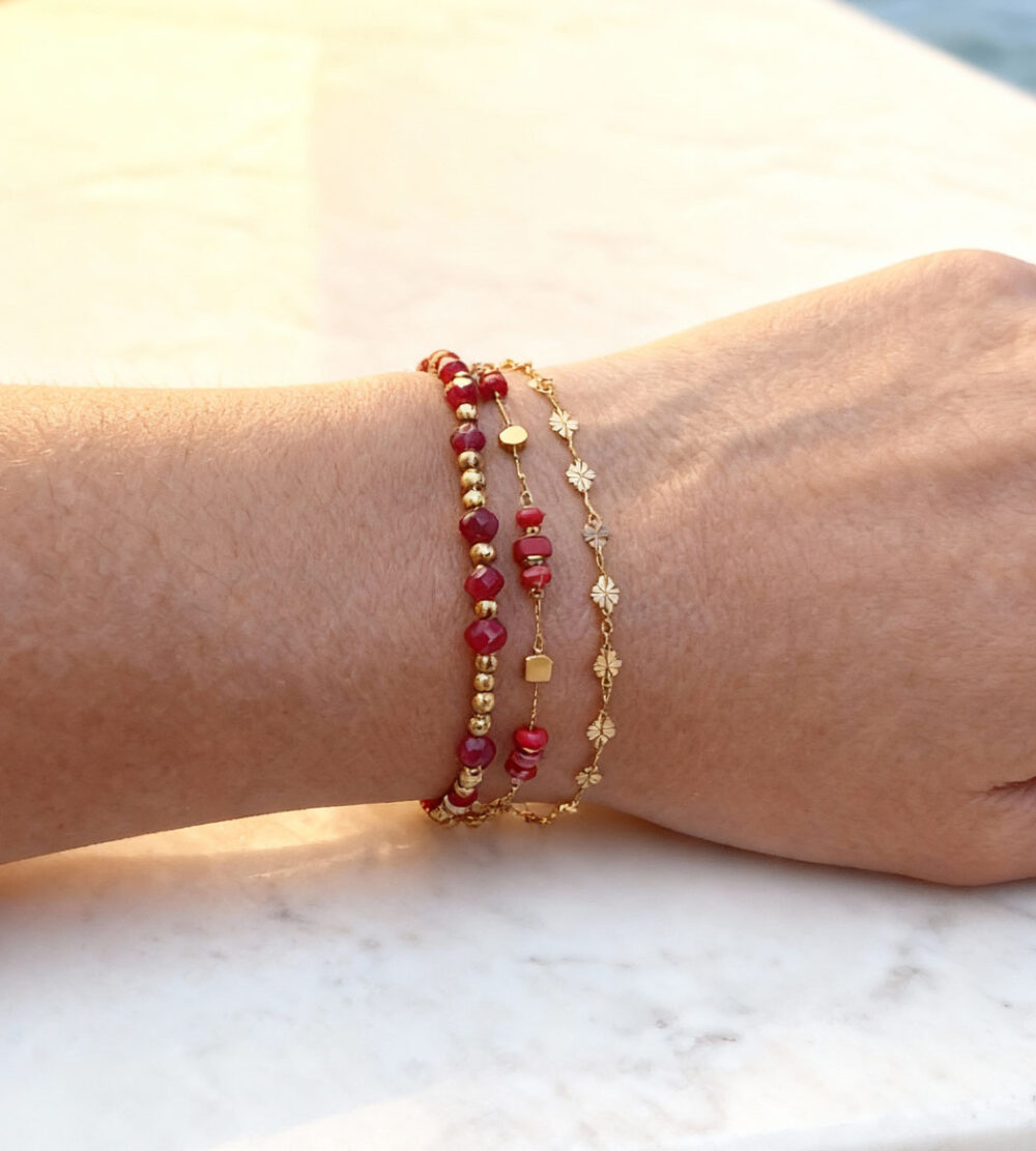 Bracelet multi-rangs doré mêlant chaînettes texturées et rangs de perles dorées et de pierres naturelles d’agate bordeaux facettées. Ligne fine mais présente, pensée comme un stack prêt-à-porter. Souple et léger, il apporte une touche couleur vin au poignet.