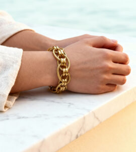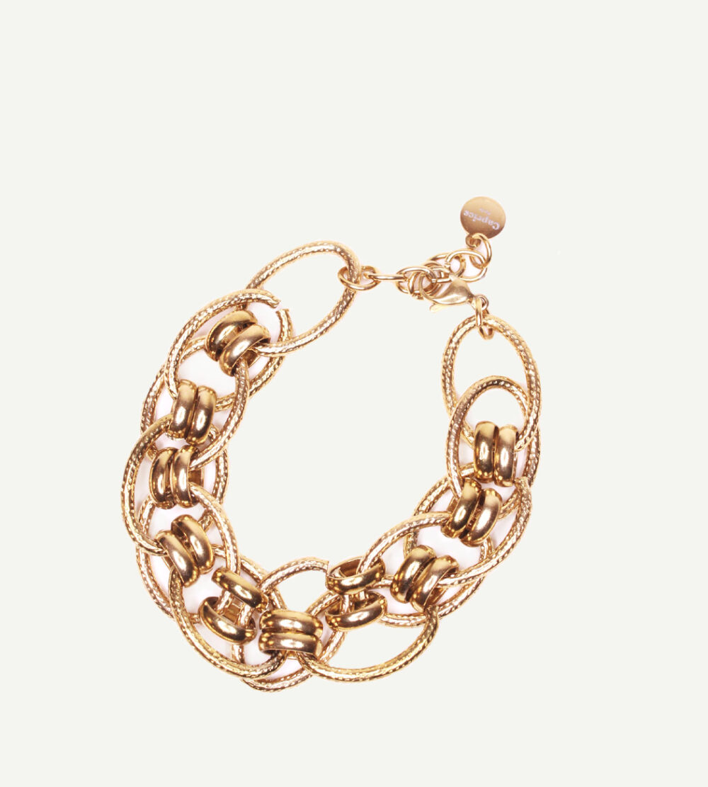 Bracelet chaîne or aux maillons larges et entrelacés. Généreux et fluide, il épouse le poignet avec souplesse.