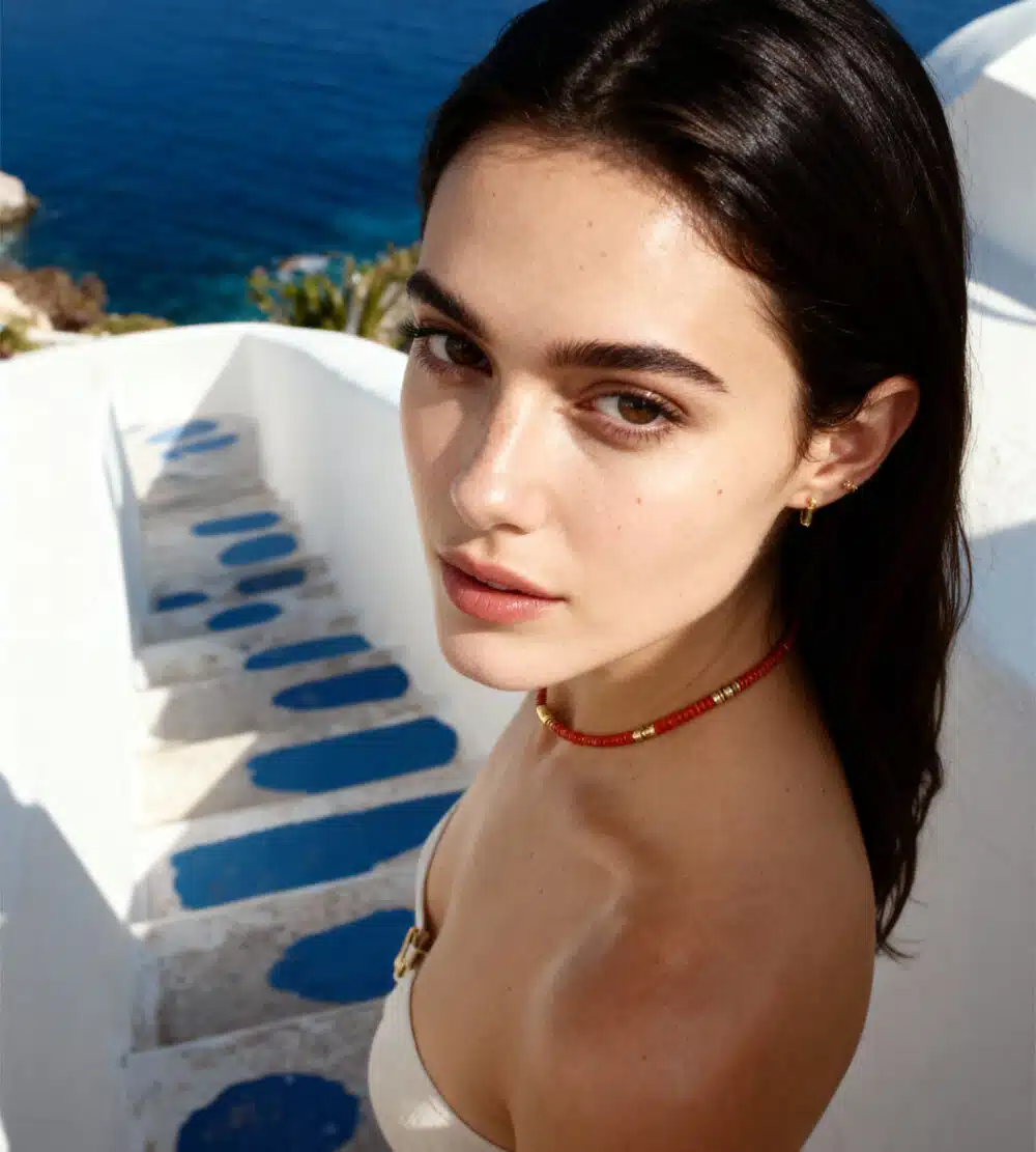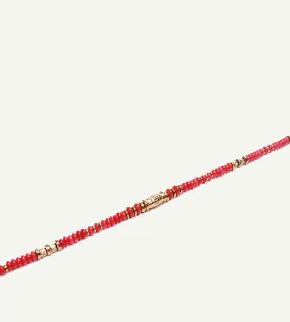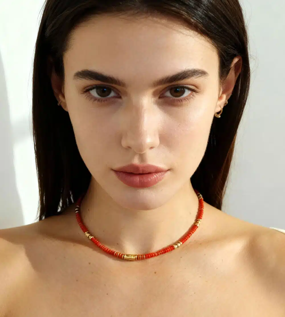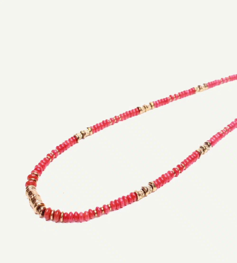 Collier court en perles heishi rouges et perles de corail rythmées de modules dorés gravés. Ligne régulière, coloris franc, qui pose une touche de caractère sur vos looks. Léger et souple, il se porte seul ou en layering avec vos chaînes fines.