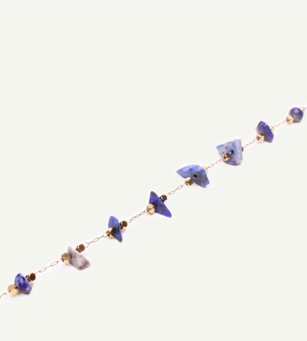Collier chaîne dorée serti d’éclats de lapis-lazuli bruts, ponctués de micro-perles dorées. Le rythme irrégulier donne une ligne moderne, légère, facile à superposer.