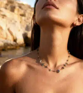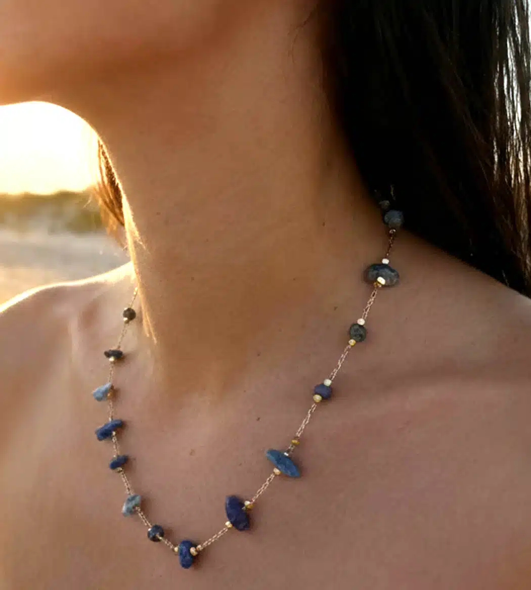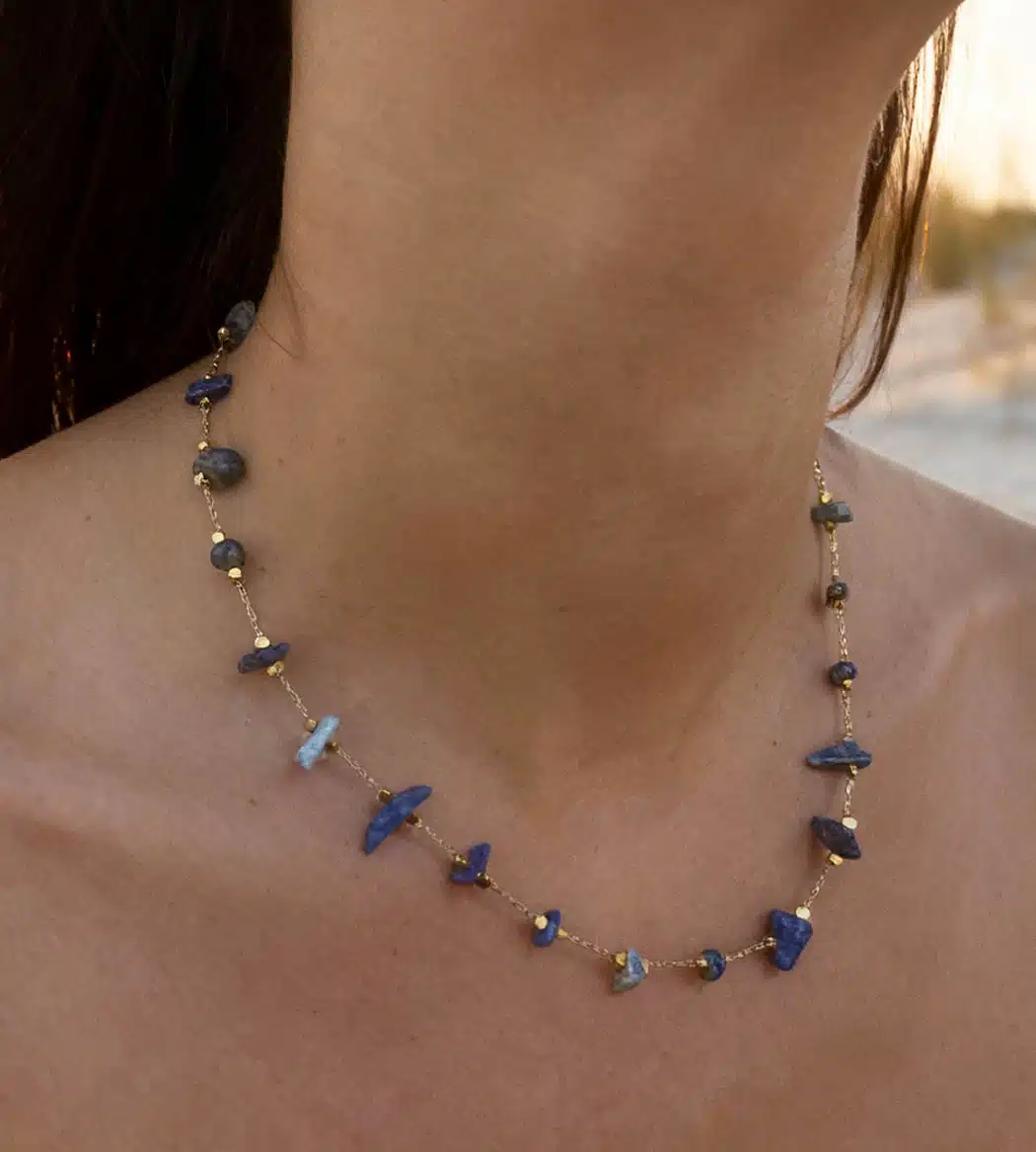 Collier fin dorée serti de pierres de lapis-lazuli brutes, ponctuées de micro-perles dorées. Chaque fragment est unique — comme des galets ramassés sur une plage des Cyclades — pour un rendu irrégulier qui donne une ligne moderne, légère, facile à superposer. Parfait seul pour une touche azurée, ou en layering avec vos médailles dorées.