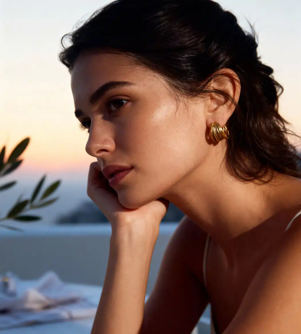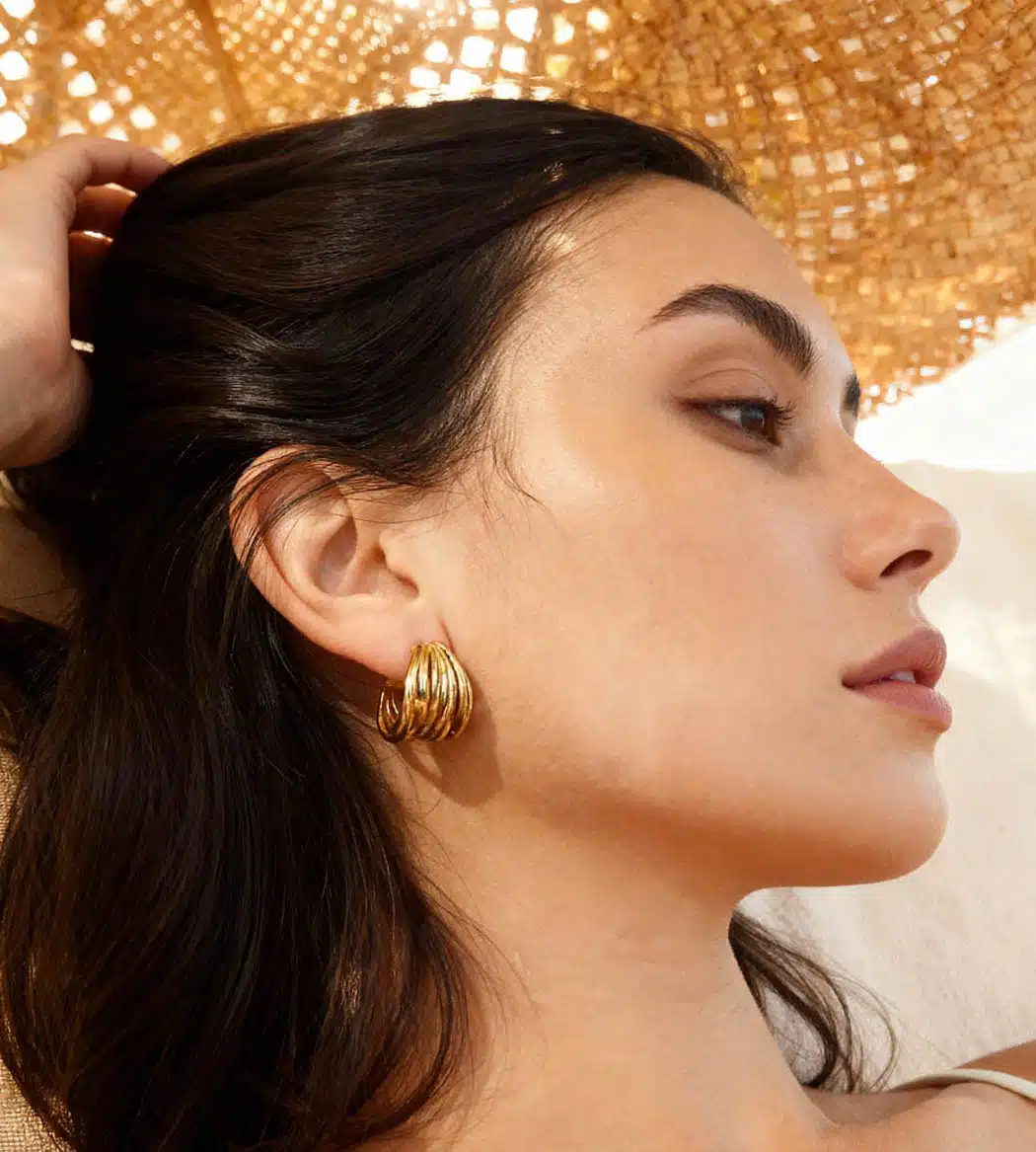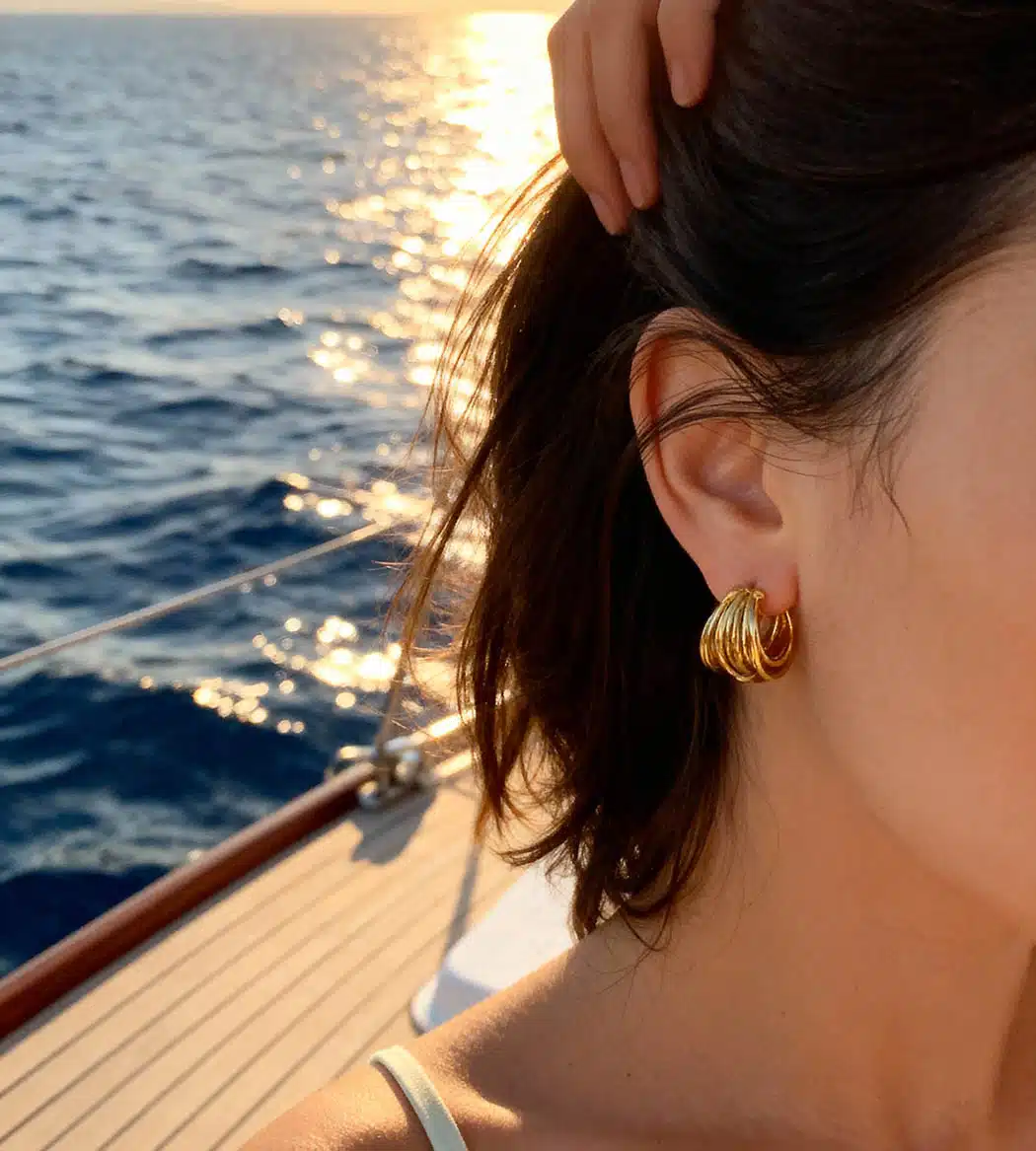 Petites créoles dorées au design multi-anneaux, les boucles Kyma dessinent un joli effet d’empilement façon manchette. Légères et lumineuses, elles se portent seules pour un chic minimal ou en mix & match avec les perles bleu Égée et bordeaux de la collection. Fermoir tige pour un porté sûr, idéal du quotidien aux soirées.